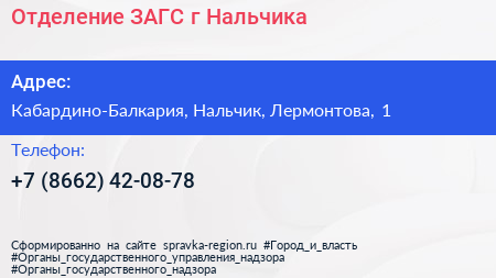Отделение ЗАГС г. Нальчика по адресу Кабардино-Балкария, Нальчик, Лермонтова, 1 в дальнейшем Организация, размещена в следующих категориях: