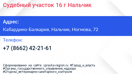 Судебный участок №16 г. Нальчик по адресу Кабардино-Балкария, Нальчик, Ногмова, 72 в дальнейшем Организация, размещена в следующих категориях: