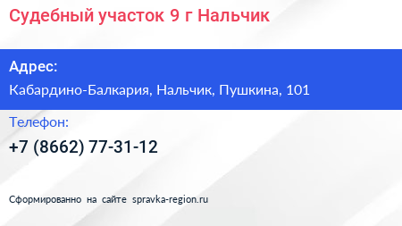 Судебный участок №9, г. Нальчик по адресу Кабардино-Балкария, Нальчик, Пушкина, 101 в дальнейшем Организация, размещена в следующих категориях: