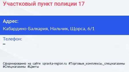 Участковый пункт полиции №17 по адресу Кабардино-Балкария, Нальчик, Щорса, 6/1 в дальнейшем Организация, размещена в следующих категориях: