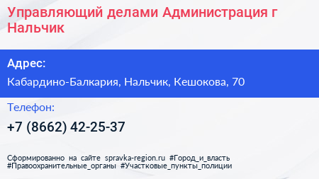 Управляющий делами, Администрация г. Нальчик по адресу Кабардино-Балкария, Нальчик, Кешокова, 70 в дальнейшем Организация, размещена в следующих категориях: