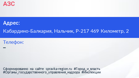 АЗС по адресу Кабардино-Балкария, Нальчик, Р-217 469 Километр, 2 в дальнейшем Организация, размещена в следующих категориях: