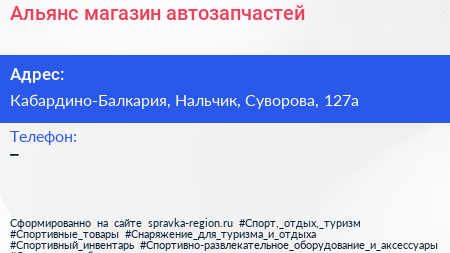 Альянс, магазин автозапчастей по адресу Кабардино-Балкария, Нальчик, Суворова, 127а в дальнейшем Организация, размещена в следующих категориях:
