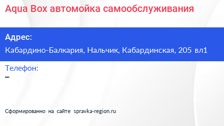 Aqua Box, автомойка самообслуживания по адресу Кабардино-Балкария, Нальчик, Кабардинская, 205 вл1 в дальнейшем Организация, размещена в следующих категориях: