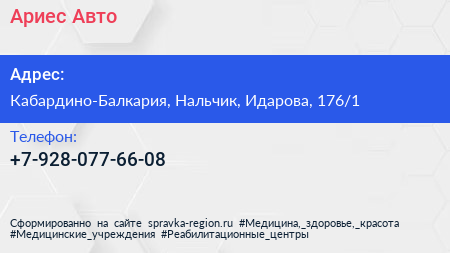 Ариес Авто по адресу Кабардино-Балкария, Нальчик, Идарова, 176/1 в дальнейшем Организация, размещена в следующих категориях: