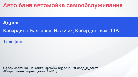Авто баня, автомойка самообслуживания по адресу Кабардино-Балкария, Нальчик, Кабардинская, 149а в дальнейшем Организация, размещена в следующих категориях: