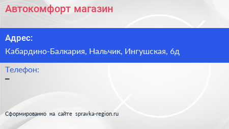Автокомфорт, магазин по адресу Кабардино-Балкария, Нальчик, Ингушская, 6д в дальнейшем Организация, размещена в следующих категориях: