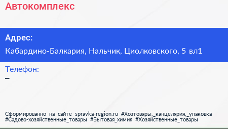 Автокомплекс по адресу Кабардино-Балкария, Нальчик, Циолковского, 5 вл1 в дальнейшем Организация, размещена в следующих категориях: