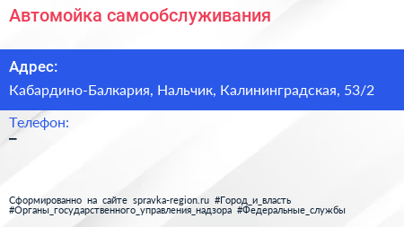 Автомойка самообслуживания по адресу Кабардино-Балкария, Нальчик, Калининградская, 53/2 в дальнейшем Организация, размещена в следующих категориях: