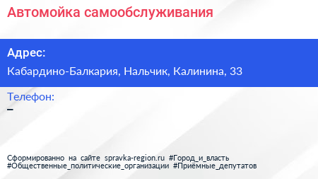 Автомойка самообслуживания по адресу Кабардино-Балкария, Нальчик, Калинина, 33 в дальнейшем Организация, размещена в следующих категориях: