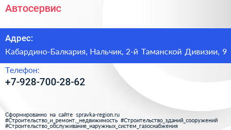 Автосервис по адресу Кабардино-Балкария, Нальчик, 2-й Таманской Дивизии, 9 в дальнейшем Организация, размещена в следующих категориях:
