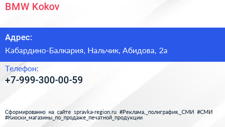 BMW-Kokov по адресу Кабардино-Балкария, Нальчик, Абидова, 2а в дальнейшем Организация, размещена в следующих категориях: