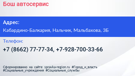 Бош, автосервис по адресу Кабардино-Балкария, Нальчик, Мальбахова, 3Б в дальнейшем Организация, размещена в следующих категориях:
