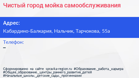 Чистый город, мойка самообслуживания по адресу Кабардино-Балкария, Нальчик, Тарчокова, 55а в дальнейшем Организация, размещена в следующих категориях: