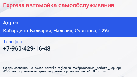 Express, автомойка самообслуживания по адресу Кабардино-Балкария, Нальчик, Суворова, 129а в дальнейшем Организация, размещена в следующих категориях: