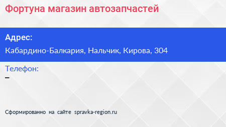 Фортуна, магазин автозапчастей по адресу Кабардино-Балкария, Нальчик, Кирова, 304 в дальнейшем Организация, размещена в следующих категориях: