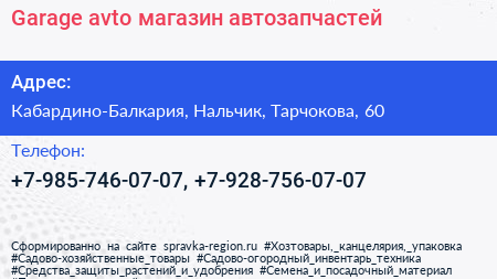 Garage avto, магазин автозапчастей по адресу Кабардино-Балкария, Нальчик, Тарчокова, 60 в дальнейшем Организация, размещена в следующих категориях: