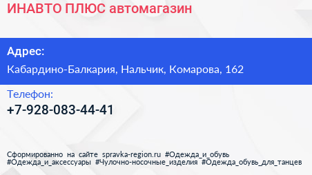 ИНАВТО ПЛЮС, автомагазин по адресу Кабардино-Балкария, Нальчик, Комарова, 162 в дальнейшем Организация, размещена в следующих категориях: