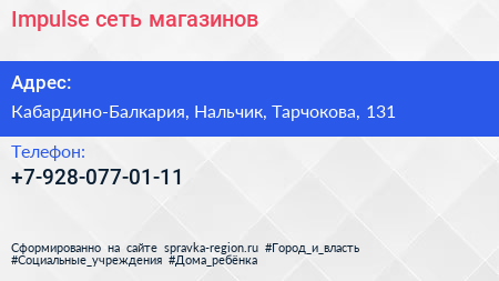Impulse, сеть магазинов по адресу Кабардино-Балкария, Нальчик, Тарчокова, 131 в дальнейшем Организация, размещена в следующих категориях: