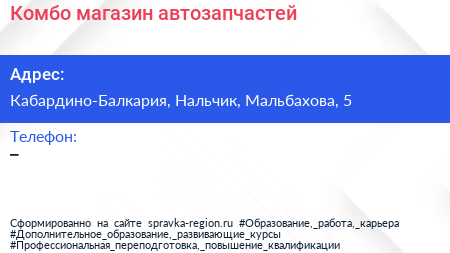 Комбо, магазин автозапчастей по адресу Кабардино-Балкария, Нальчик, Мальбахова, 5 в дальнейшем Организация, размещена в следующих категориях: