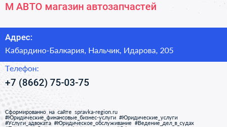 М АВТО, магазин автозапчастей по адресу Кабардино-Балкария, Нальчик, Идарова, 205 в дальнейшем Организация, размещена в следующих категориях: