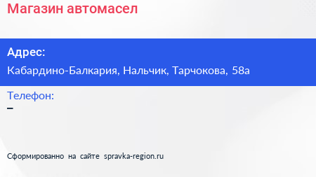 Магазин автомасел по адресу Кабардино-Балкария, Нальчик, Тарчокова, 58а в дальнейшем Организация, размещена в следующих категориях:
