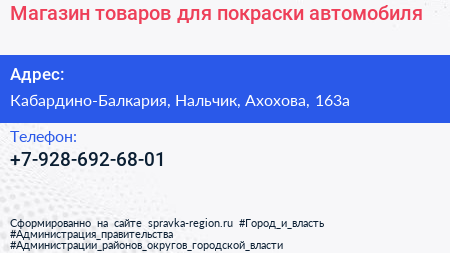 Магазин товаров для покраски автомобиля по адресу Кабардино-Балкария, Нальчик, Ахохова, 163а в дальнейшем Организация, размещена в следующих категориях: