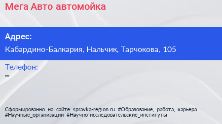 Мега-Авто, автомойка по адресу Кабардино-Балкария, Нальчик, Тарчокова, 105 в дальнейшем Организация, размещена в следующих категориях: