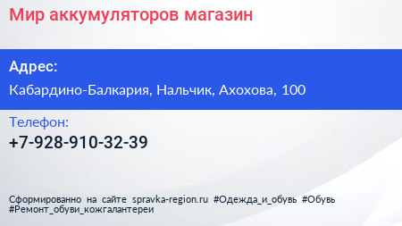 Мир аккумуляторов, магазин по адресу Кабардино-Балкария, Нальчик, Ахохова, 100 в дальнейшем Организация, размещена в следующих категориях: