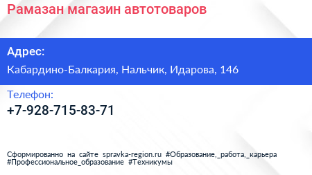 Рамазан, магазин автотоваров по адресу Кабардино-Балкария, Нальчик, Идарова, 146 в дальнейшем Организация, размещена в следующих категориях: