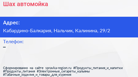 Шах, автомойка по адресу Кабардино-Балкария, Нальчик, Калинина, 29/2 в дальнейшем Организация, размещена в следующих категориях: