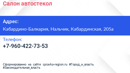 Салон автостекол по адресу Кабардино-Балкария, Нальчик, Кабардинская, 205а в дальнейшем Организация, размещена в следующих категориях: