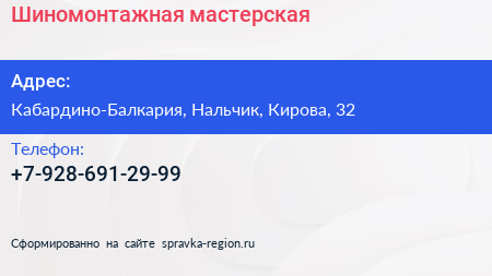 Шиномонтажная мастерская по адресу Кабардино-Балкария, Нальчик, Кирова, 32 в дальнейшем Организация, размещена в следующих категориях: