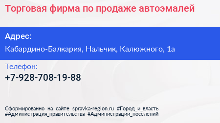 Торговая фирма по продаже автоэмалей по адресу Кабардино-Балкария, Нальчик, Калюжного, 1а в дальнейшем Организация, размещена в следующих категориях: