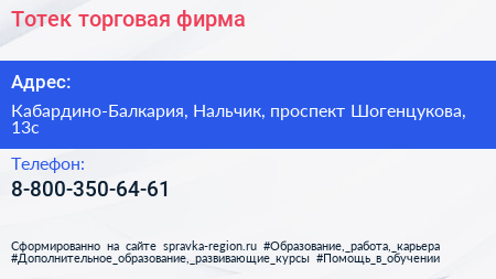 Тотек, торговая фирма по адресу Кабардино-Балкария, Нальчик, проспект Шогенцукова, 13с в дальнейшем Организация, размещена в следующих категориях: