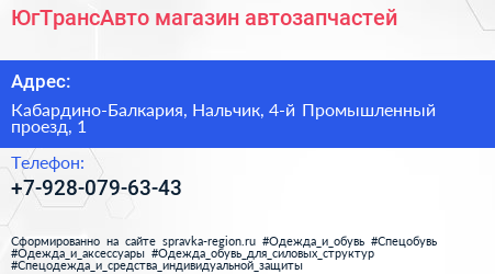 ЮгТрансАвто, магазин автозапчастей по адресу Кабардино-Балкария, Нальчик, 4-й Промышленный проезд, 1 в дальнейшем Организация, размещена в следующих категориях: