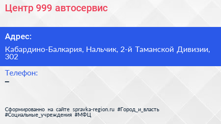Центр 999, автосервис по адресу Кабардино-Балкария, Нальчик, 2-й Таманской Дивизии, 302 в дальнейшем Организация, размещена в следующих категориях: