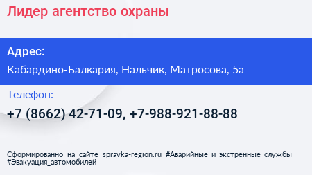 Лидер, агентство охраны по адресу Кабардино-Балкария, Нальчик, Матросова, 5а в дальнейшем Организация, размещена в следующих категориях: