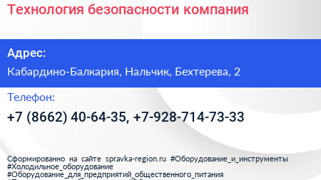 Технология безопасности, компания по адресу Кабардино-Балкария, Нальчик, Бехтерева, 2 в дальнейшем Организация, размещена в следующих категориях: