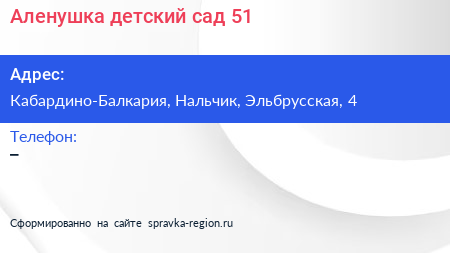 Аленушка, детский сад №51 по адресу Кабардино-Балкария, Нальчик, Эльбрусская, 4 в дальнейшем Организация, размещена в следующих категориях: