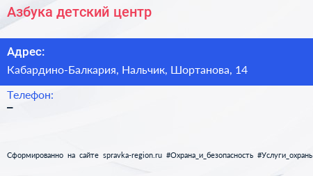 Азбука, детский центр по адресу Кабардино-Балкария, Нальчик, Шортанова, 14 в дальнейшем Организация, размещена в следующих категориях: