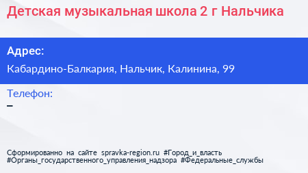 Детская музыкальная школа №2 г. Нальчика по адресу Кабардино-Балкария, Нальчик, Калинина, 99 в дальнейшем Организация, размещена в следующих категориях: