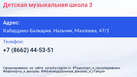 Детская музыкальная школа №3 по адресу Кабардино-Балкария, Нальчик, Мазлоева, 47/1 в дальнейшем Организация, размещена в следующих категориях: