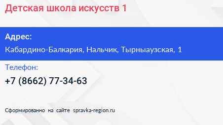 Детская школа искусств №1 по адресу Кабардино-Балкария, Нальчик, Тырныаузская, 1 в дальнейшем Организация, размещена в следующих категориях: