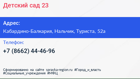 Детский сад №23 по адресу Кабардино-Балкария, Нальчик, Туриста, 52а в дальнейшем Организация, размещена в следующих категориях: