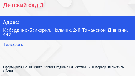 Детский сад №3 по адресу Кабардино-Балкария, Нальчик, 2-й Таманской Дивизии, 442 в дальнейшем Организация, размещена в следующих категориях: