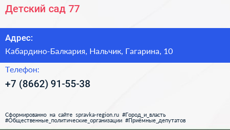 Детский сад №77 по адресу Кабардино-Балкария, Нальчик, Гагарина, 10 в дальнейшем Организация, размещена в следующих категориях: