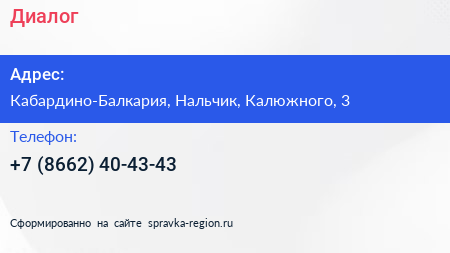 Диалог по адресу Кабардино-Балкария, Нальчик, Калюжного, 3 в дальнейшем Организация, размещена в следующих категориях: