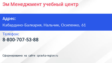 Эм Менеджмент, учебный центр по адресу Кабардино-Балкария, Нальчик, Осипенко, 61 в дальнейшем Организация, размещена в следующих категориях:
