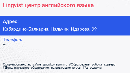 Lingvist, центр английского языка по адресу Кабардино-Балкария, Нальчик, Идарова, 99 в дальнейшем Организация, размещена в следующих категориях: